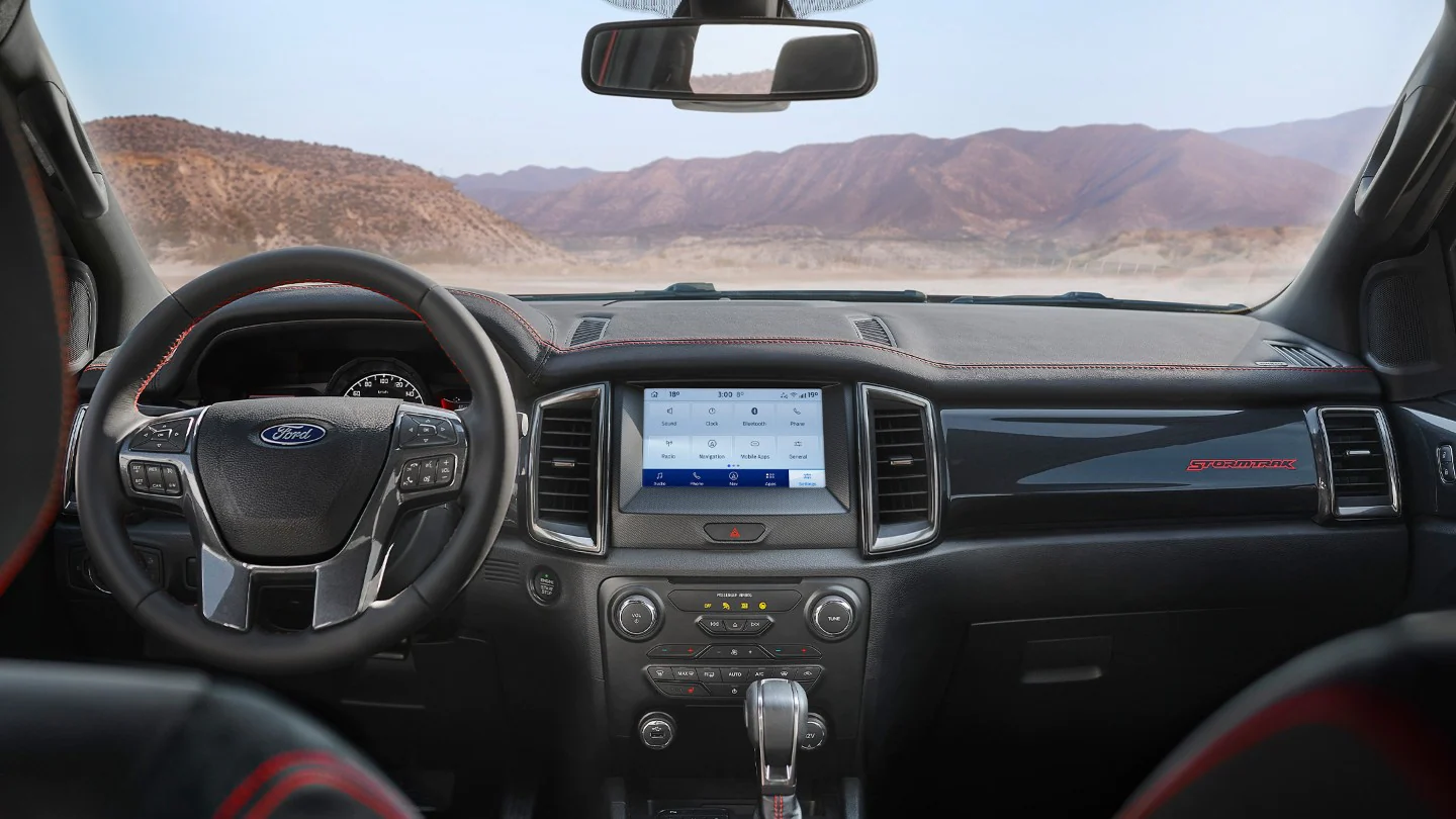Çfarëdo që ndodh jashtë, brenda Stormtrak gjithçka është e qetë, e rehatshme dhe pa mundim nën kontroll. Një mori detajesh premium të brendshme ju ndihmojnë të ndiheni si në shtëpi. Sediljet prej lëkure cilësore me qepje të detajeve në ngjyrë të kuqe race, pllaka me gërvishtje me ndriçim dhe dekorime unike Stormtrak i mbajnë gjërat të duken të mprehta. Nga pozicioni komandues i drejtimit, ka një mori teknologjish të arritshme me ekran me prekje me ngjyra të plota, navigim, njohje të shenjave të trafikut dhe sensorë të plotë parkimi me kamerë mbrapa. Duke punuar me qetësi në sfond, FordPass Connect ju mban të lidhur me botën jashtë.